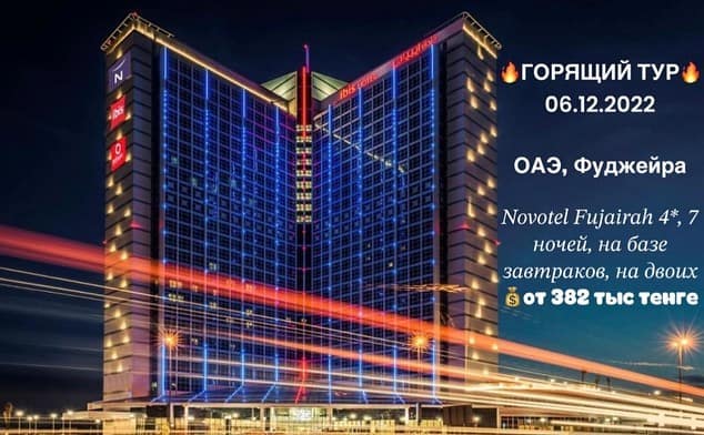 🔥ГОРЯЩИЙ ТУР🔥06.12.2022ОАЭ, ФуджейраNovotel Fujairah 4*, 7 ночей, на базе завтраков, на двоих💰от 382 тыс тенге Получить консультацию